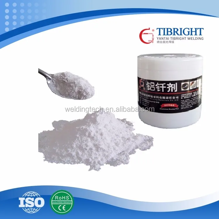 Another type is called non-corrosive aluminum flux. The most popular flux component is potassium floroaluminate (FB501). TiBright developed a new similar one with lower temeprature FB503. Also, FB502 has the main component of potassium-cesium floroaluminate. This one has low melting temperature (430C), and water soluble. It is also the most expensive one.